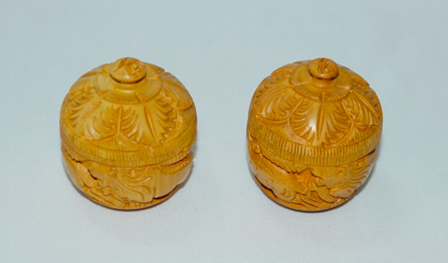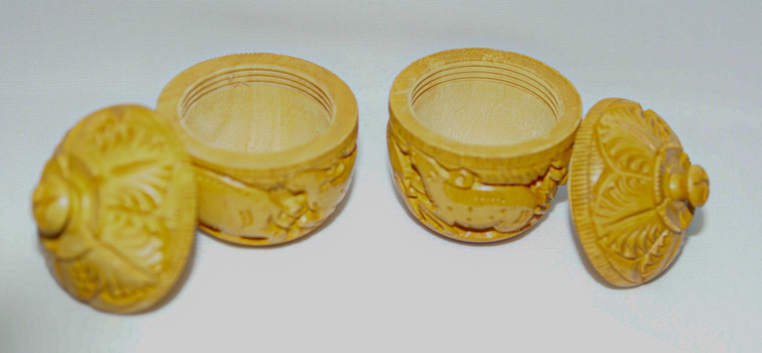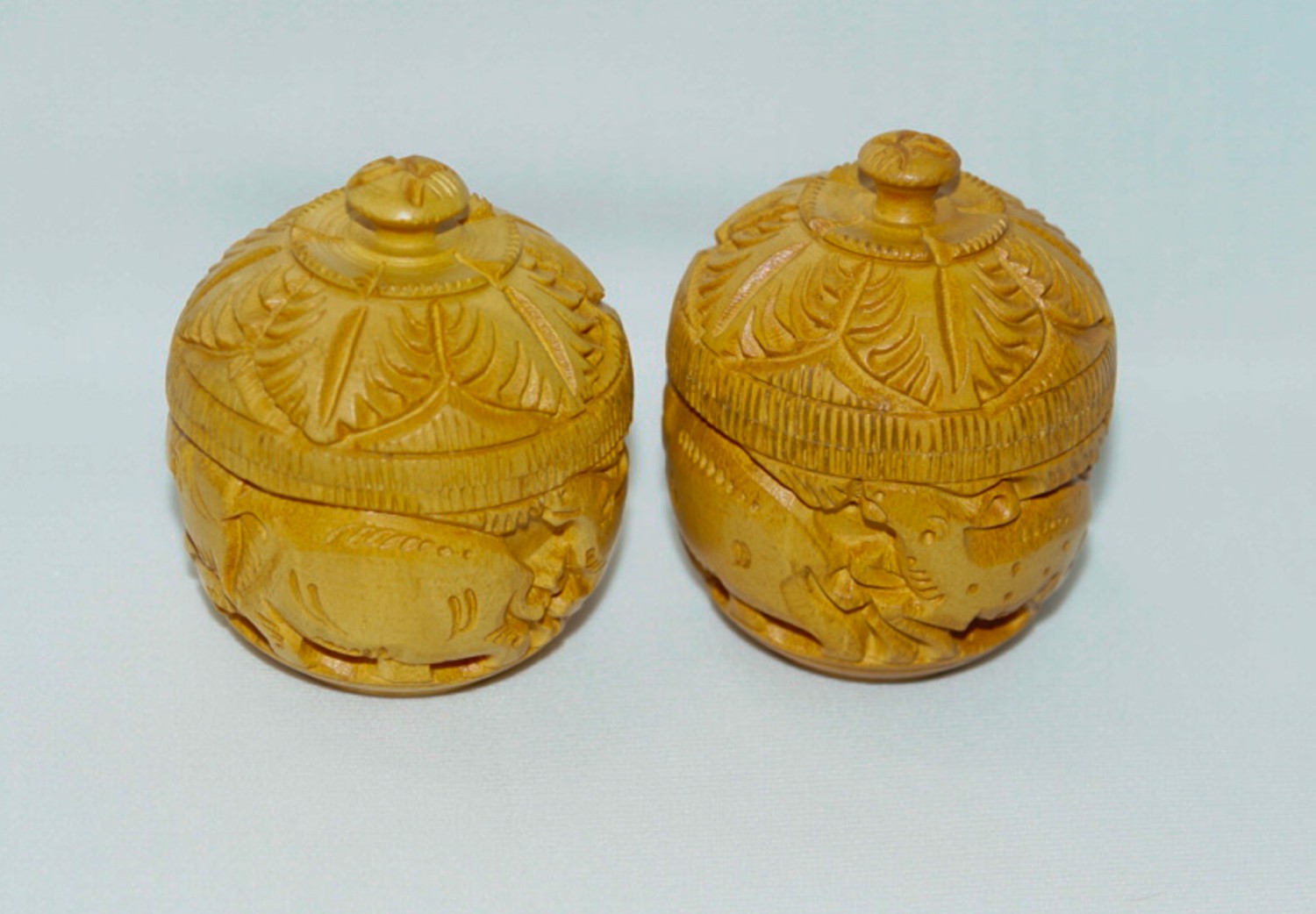 Product : Wooden Haldi - Kumkuma Container Set Colour : Wooden Benefits : Can be gifted, Contains Haldi & Kunkuma, Looks Elegant in the pooja room. must have collection.